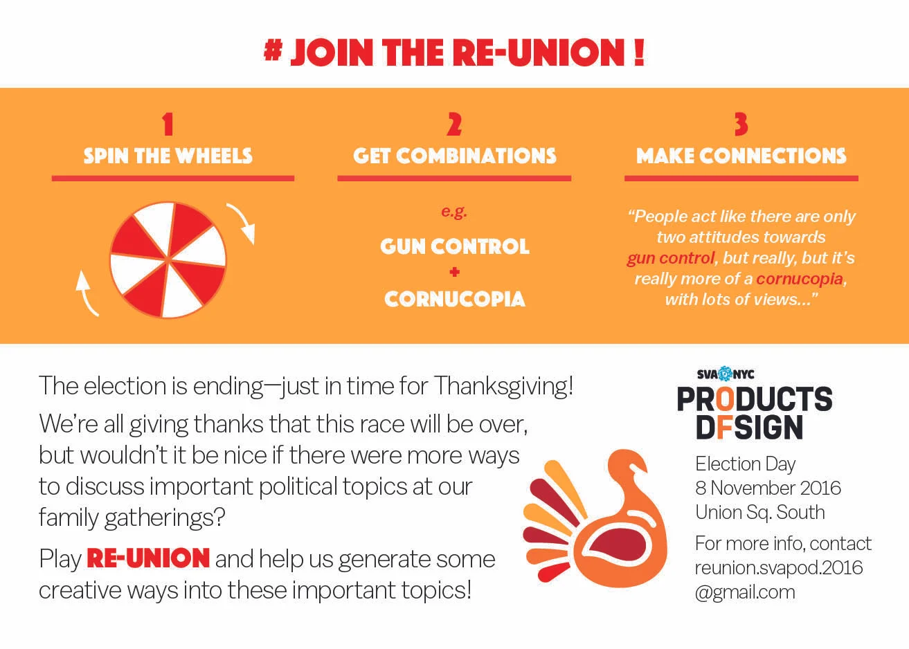 We have never been more aware of the polarization in our country, and these divisions are often deeply felt even within families. In November of 2016, looking beyond the election and towards Thanksgiving, my classmates and I designed RE-UNION, a game that generates unexpected ways into conversations about political topics at family gatherings. The project was the result of our sense that we need new ways to talk to each other about politics if we are to overcome partisan and ideological divisions and collaborate across differences. After all, if we can’t do it with our family, how can we do it as a country?