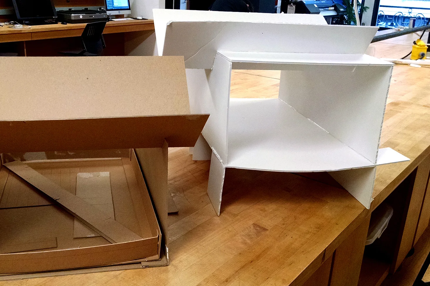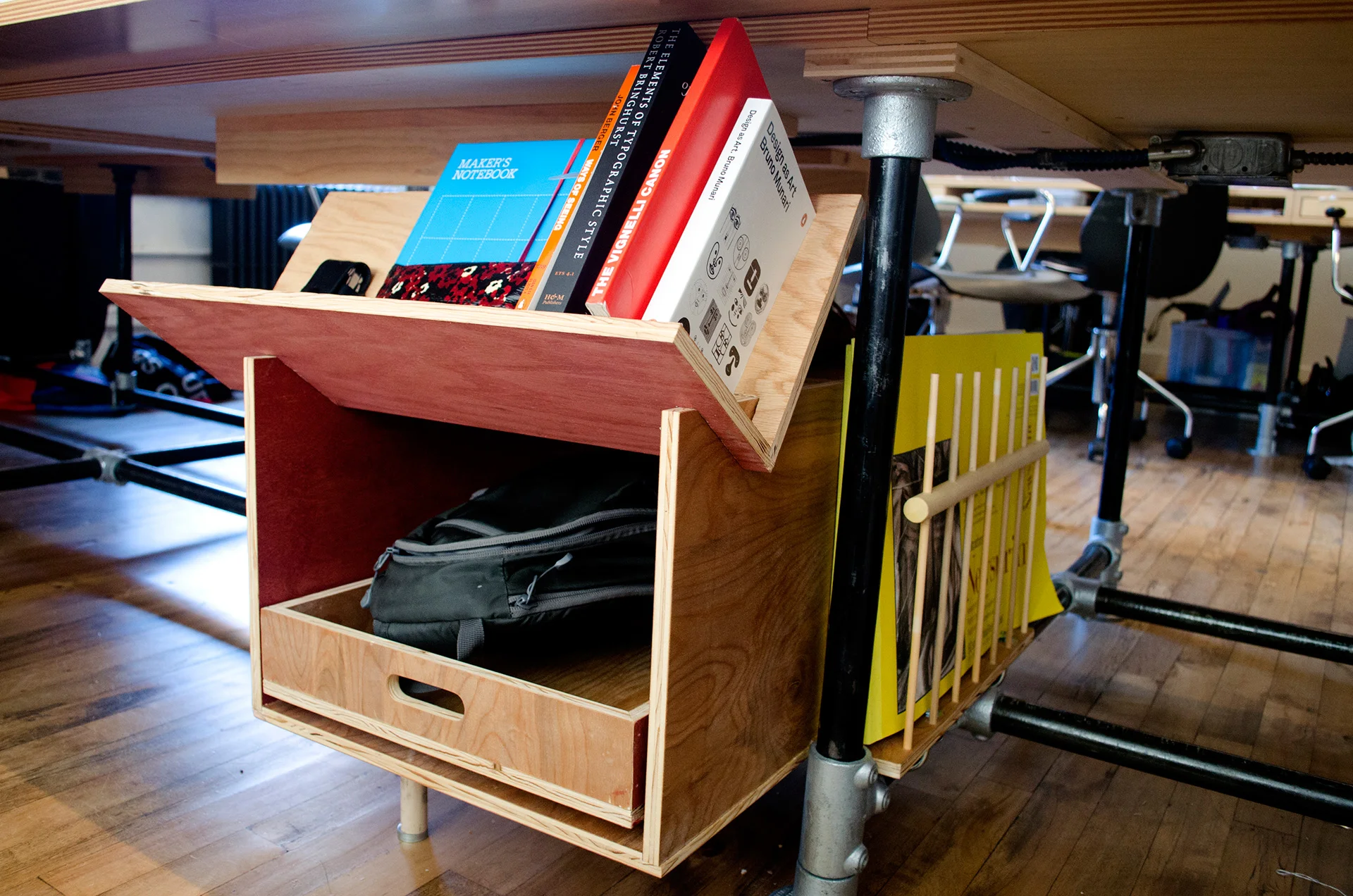 Challenged to create a 'desk hack' to attach to the pipes along the PoD desks, I designed and built a modular storage piece, complete with drawer, rack, folder, and angled shelf.