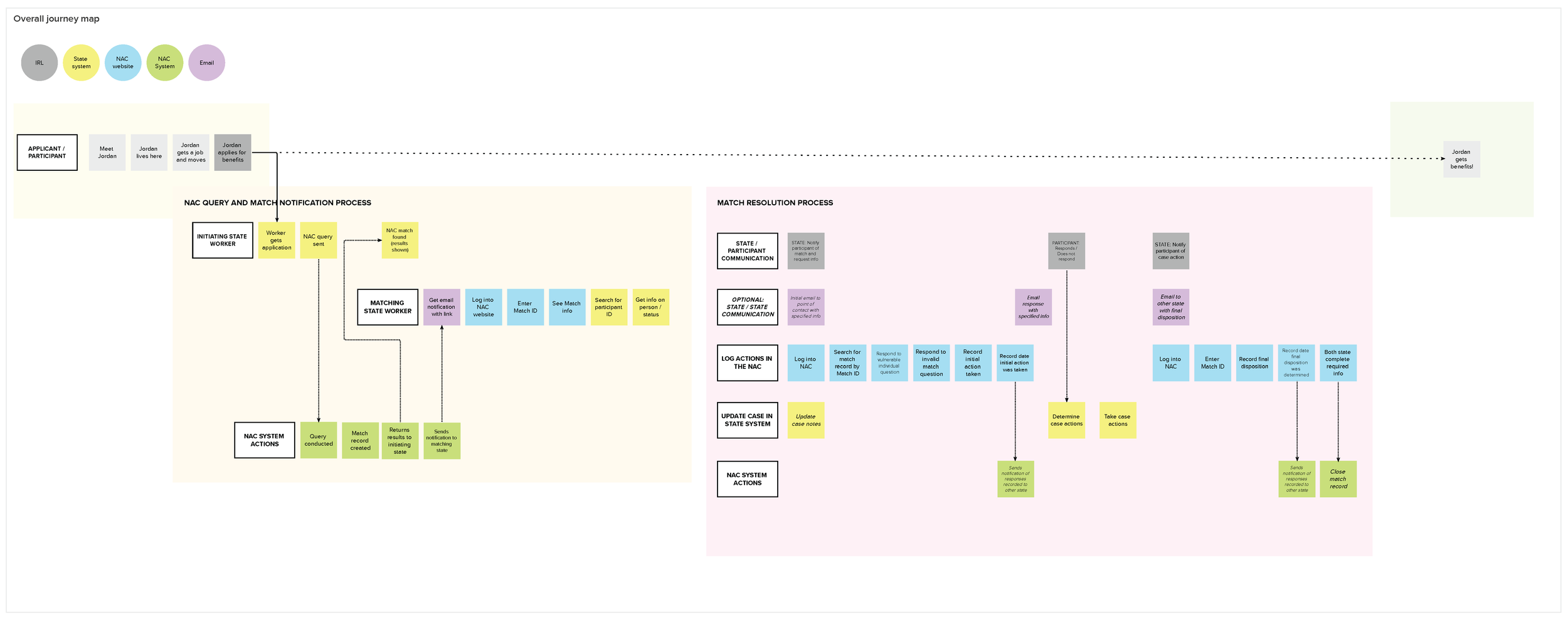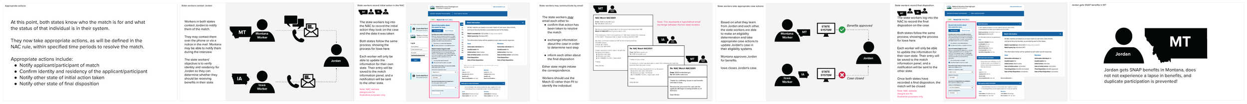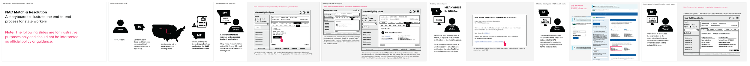 I mapped the existing SNAP application workflow to clarify exactly where and how the NAC would intervene, then storyboarded the new workflow for internal alignment, state collaboration, and development handoff. I also created a diagram explaining the system's privacy-preserving hashing architecture — designed to get executive and state buy-in on a technically novel approach to protecting PII.