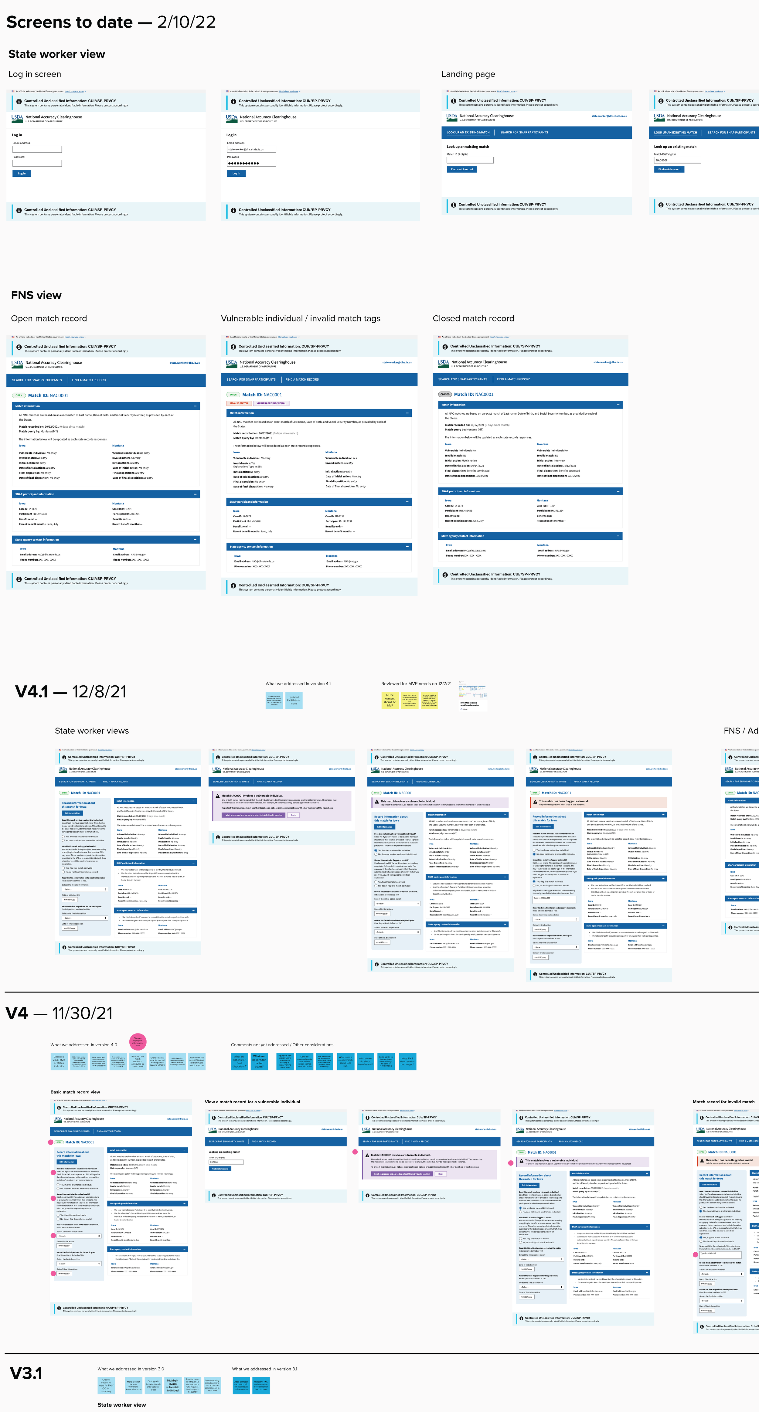 For the UI, I designed both a state worker-facing application and an FNS admin view, using USWDS with FNS branding. Iterating rapidly with pilot partners, the designs helped surface and resolve ambiguities in the match resolution process while the federal rule governing it was still being written — effectively using design as a tool to drive policy alignment.