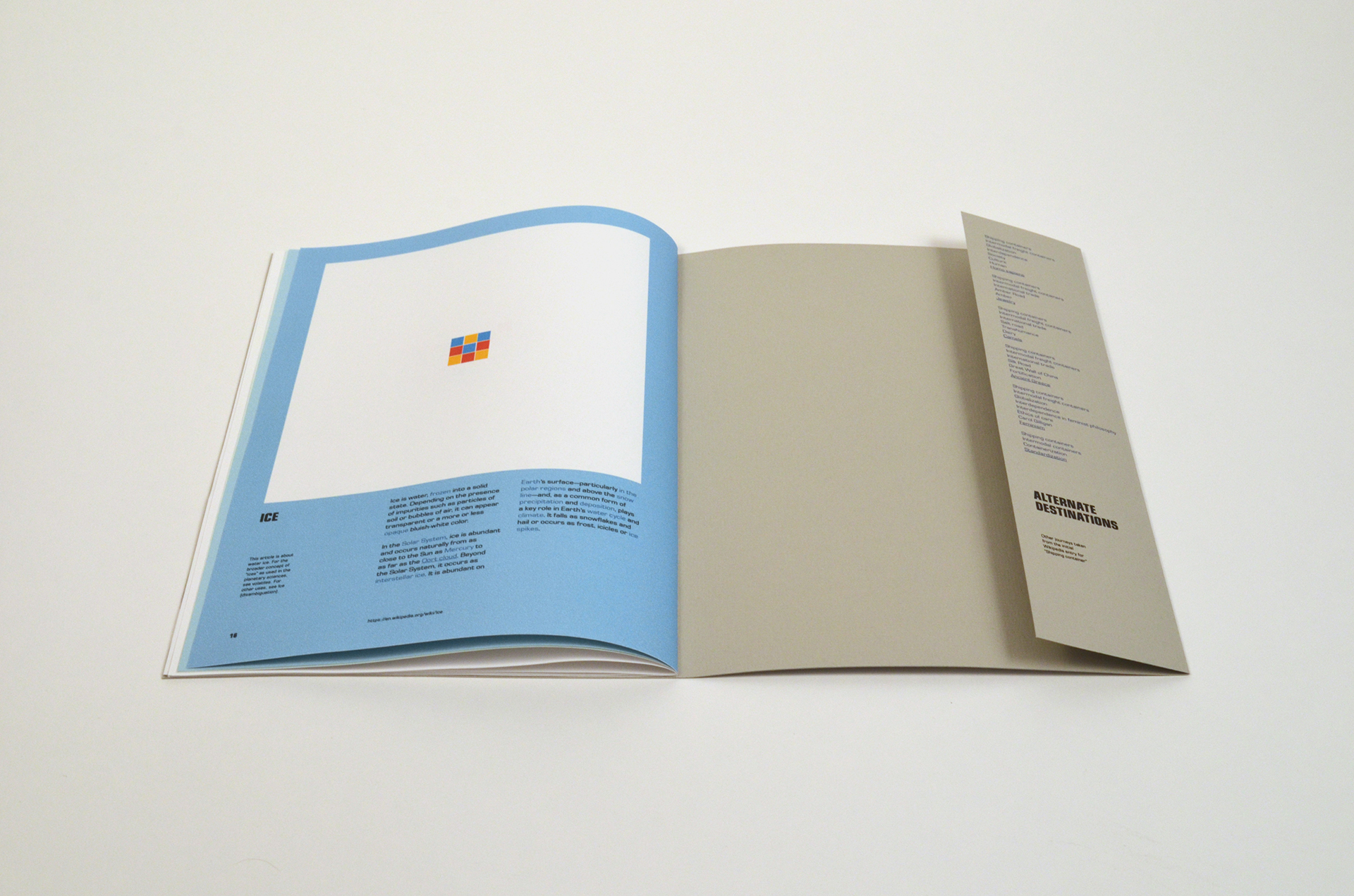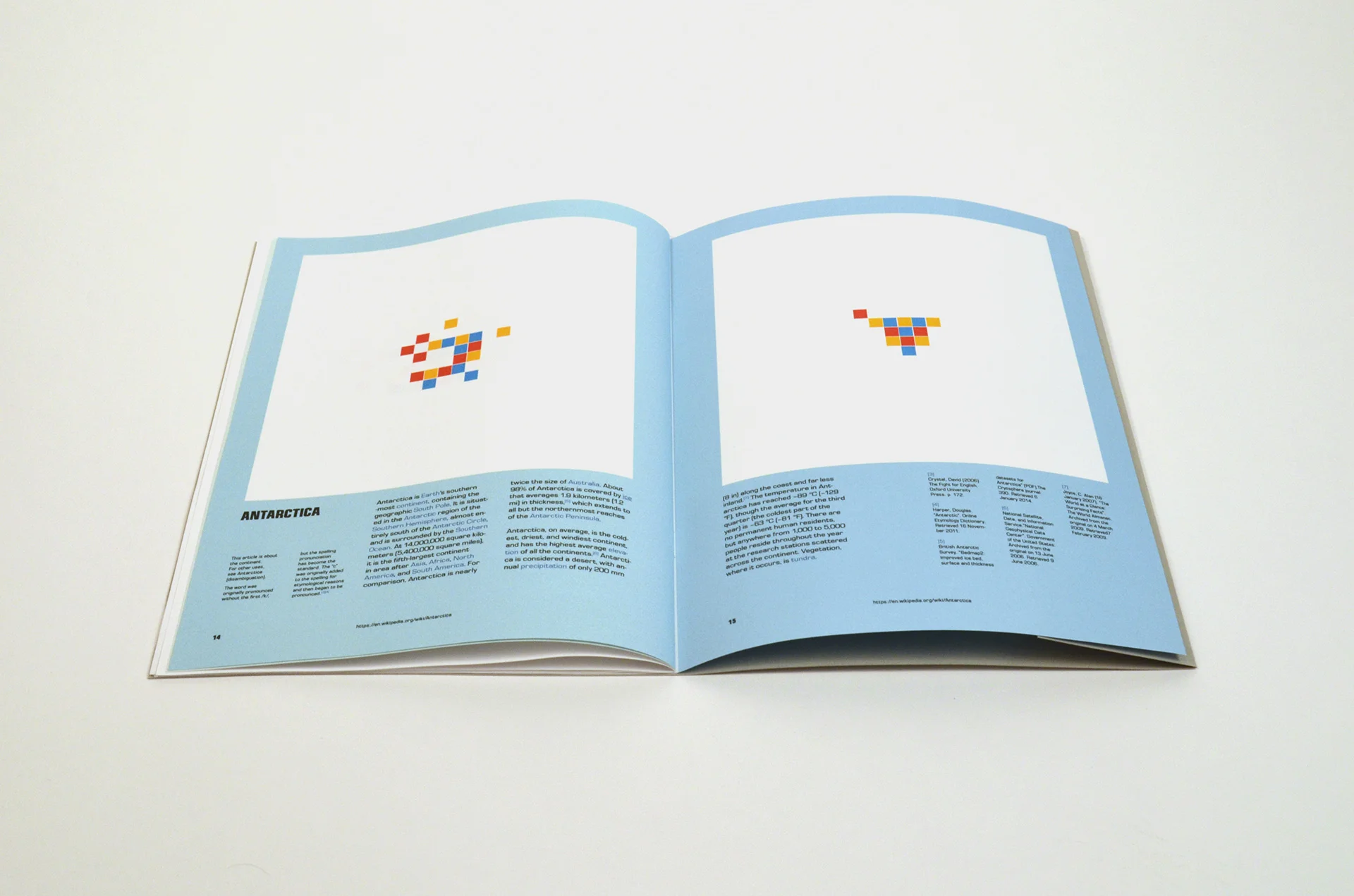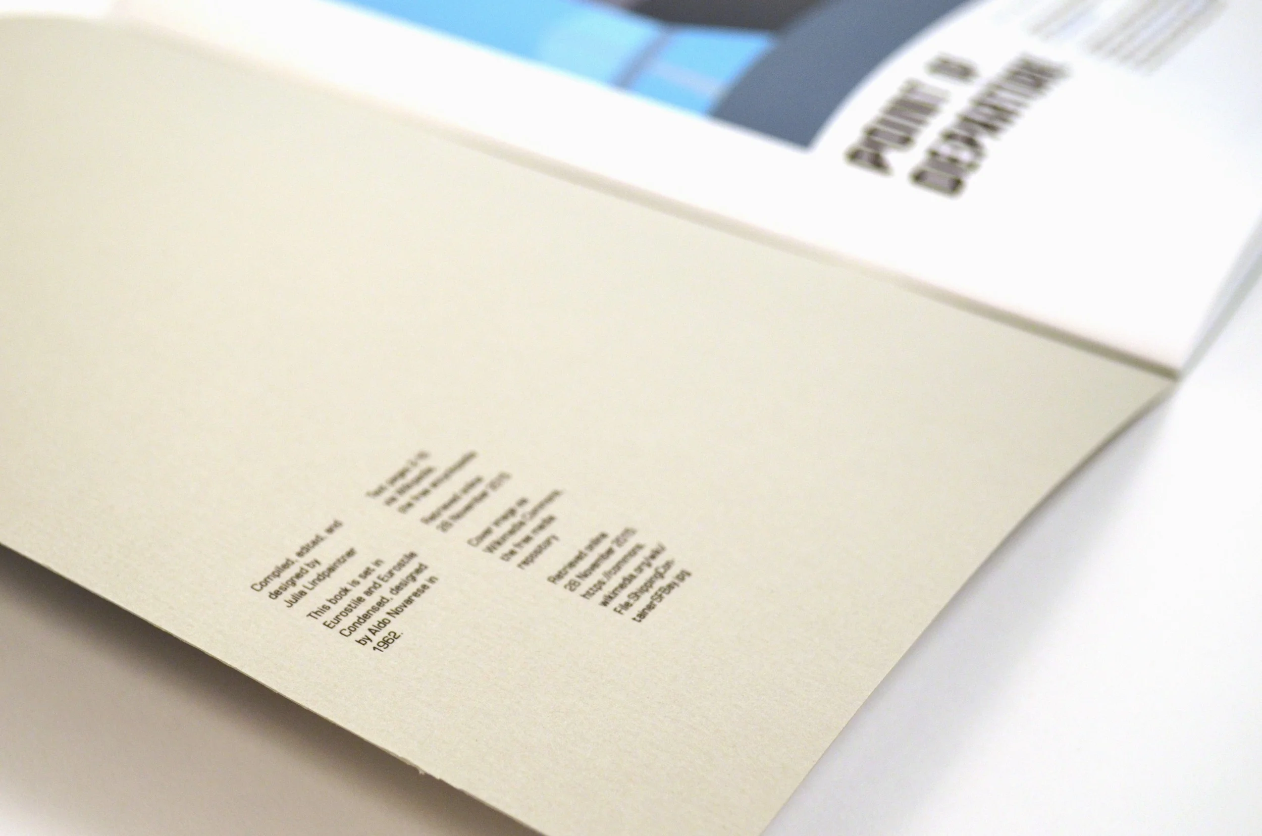 The text is set in Eurostile and Eurostile Condensed, and the frames of the images use the proportions of shipping containers. The text is set in short columns, and includes the references from the Wikipedia entries. Rather than giving the different entries chapter names, the running footer displays the source URL.
