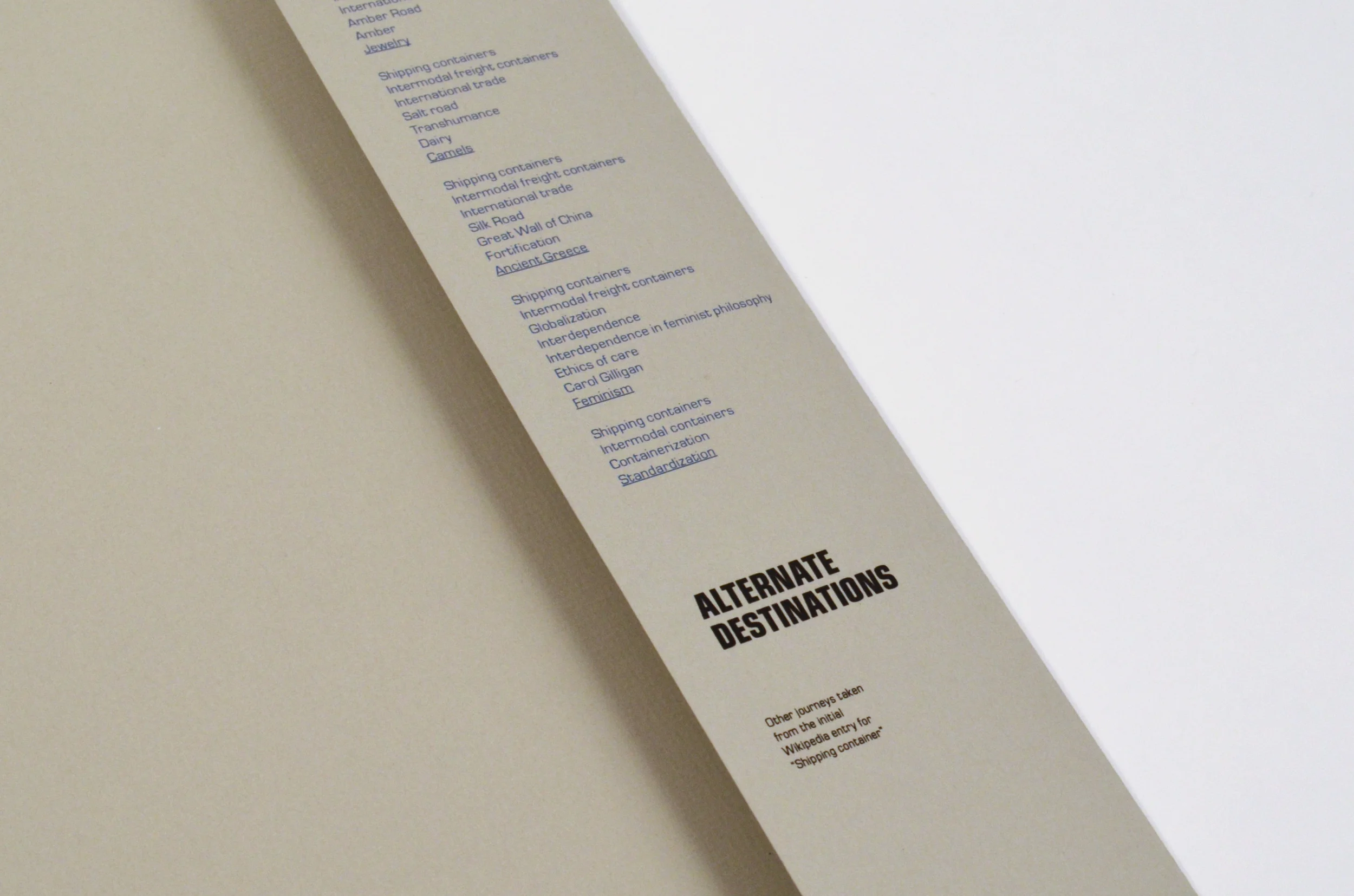 Containers make journeys. This book represents two journeys—one graphic, one textual—from a common point of departure. The graphic journey depicts a process of gradual abstraction from a photograph of shipping containers; the textual journey follows a series of links through Wikipedia, starting from the entry for shipping container.