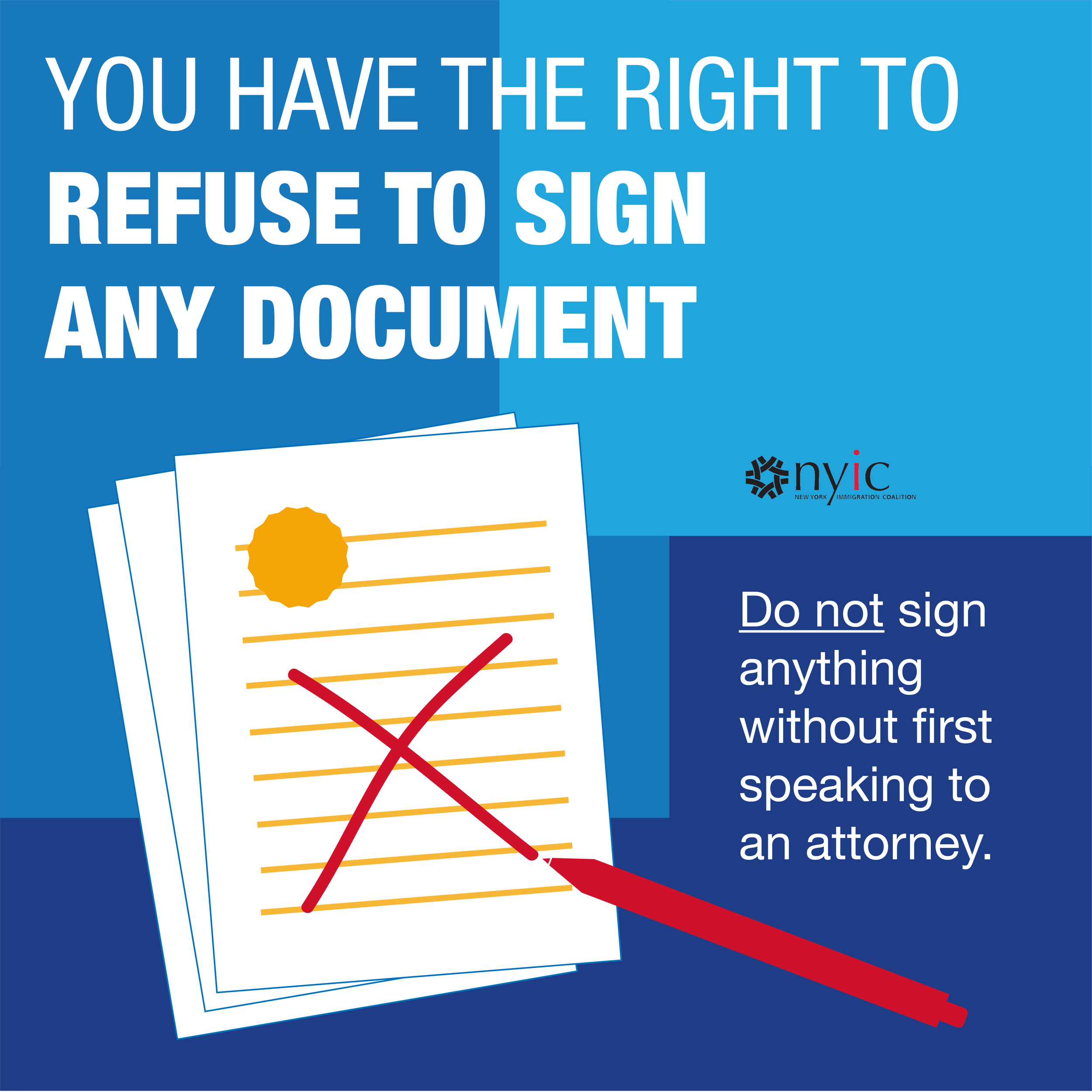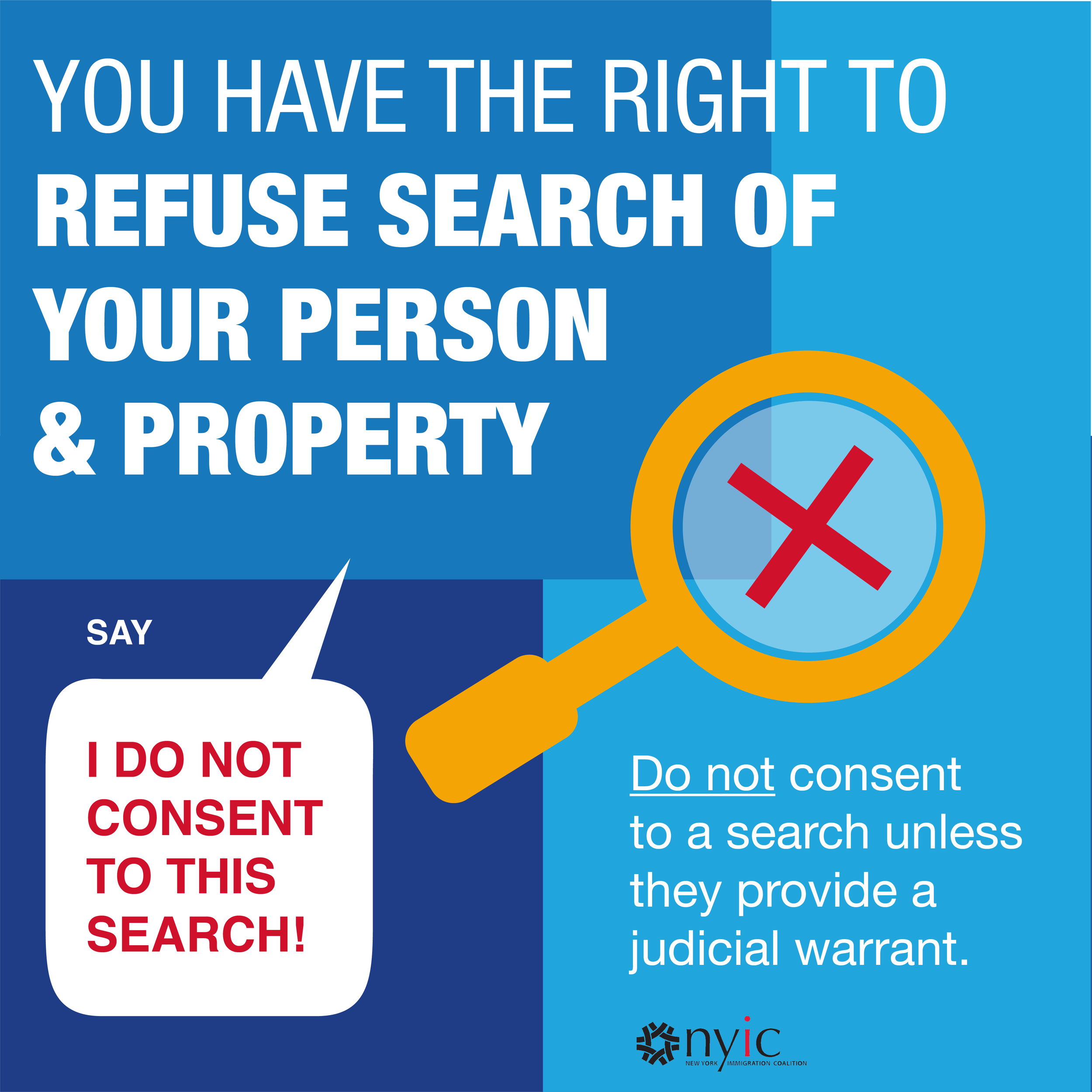 Know your rights graphics and quick guides in English, Spanish, and French for New York Immigration Coalition.